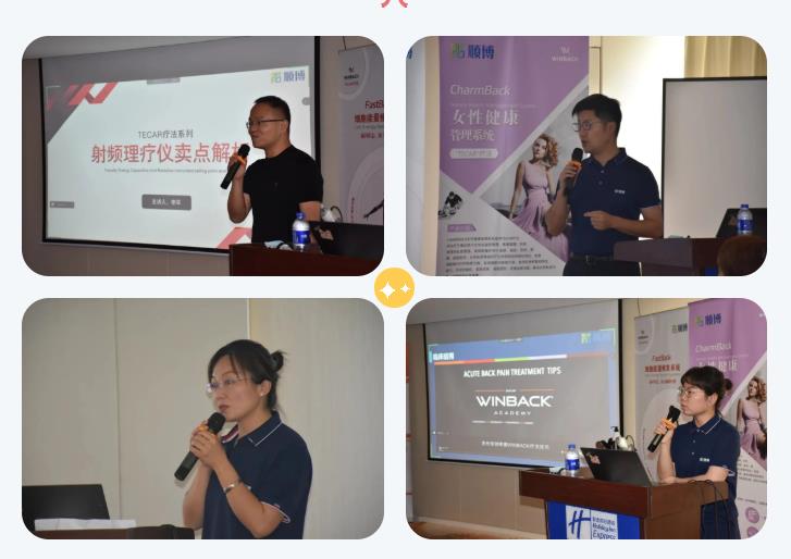 會(huì )議伊始,順博醫療營(yíng)銷(xiāo)中心銷(xiāo)售部副總監印寶劍進(jìn)行開(kāi)班致辭,在后疫情時(shí)代,順博醫療堅持常態(tài)化防疫中保證生產(chǎn)經(jīng)營(yíng)平穩有序,蓄能團隊,打磨產(chǎn)品,厚積薄發(fā)。在2021年底,順博“射頻理療儀”取得國內醫療器械注冊證,今年5月,順博“TECAR電容電阻式靶向療法”被評為國家衛生推廣技術(shù)?,F在我們的足跡已經(jīng)遍布全國,中國康復研究中心、復旦大學(xué)附屬華山醫院、浙江大學(xué)醫院附屬邵逸夫醫院、中山大學(xué)附屬第一醫院、四川大學(xué)華西醫院、福建醫科大學(xué)附屬協(xié)和醫院、吉林大學(xué)第一醫院、國家體育總局體育醫院等均是我們的用戶(hù)與合作伙伴。