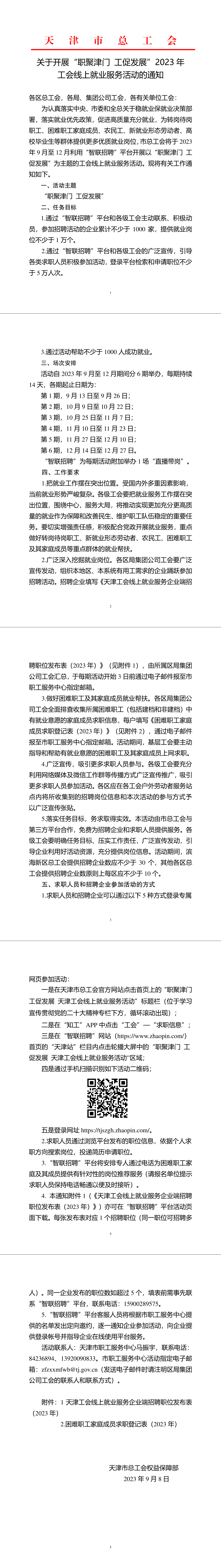 為認真落實(shí)中央、市委和全總關(guān)于穩就業(yè)保就業(yè)決策部署,落實(shí)就業(yè)優(yōu)先政策,促進(jìn)高質(zhì)量充分就業(yè),為轉崗待崗職工、困難職工家庭成員、農民工、新就業(yè)形態(tài)勞動(dòng)者、高校畢業(yè)生等群體提供更多優(yōu)質(zhì)就業(yè)崗位,市總工會(huì )將于2023年9月至12月利用“智聯(lián)招聘”平臺開(kāi)展以“職聚津門(mén) 工促發(fā)展”為主題的工會(huì )線(xiàn)上就業(yè)服務(wù)活動(dòng)。